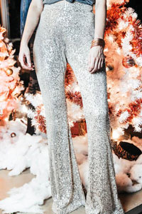 Dazzle the crowds with these stunning sequin bell bottoms from River Rose! Wear them with this off the shoulder bodysuit and timeless black mules to really let your pants shine!